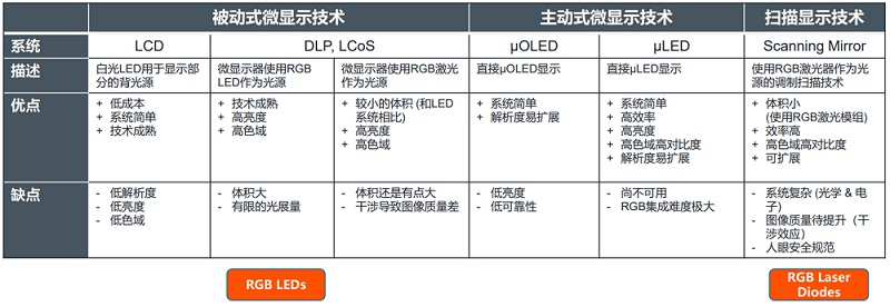 LED或者RGB激光器作为光源。被动式微显示技术在市场上已经相当成熟,通过该技术可以实现高亮度、高色域等优点,但光机体积相对其他微显示技术会相对较大,并且光展量有限。