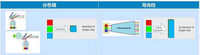 在AR中,分色镜和导光柱都是常用的合光方案。一般来讲,分色镜方案可以收取更多的光能量,因此拥有更好的颜色均一度,能够实现更高的显示亮度。但分色镜方案需要较多的光学器件,这会导致光机的尺寸较大,同时对于组装精度也有严苛的要求。而导光柱方案则不需要很多的分光镜,因此组装精度较低、光机的尺寸也相对较小,但由于排布的关系,显示器可以利用到的LED光能量较低,同时由于排布位置的差异也会使颜色均一度较差。