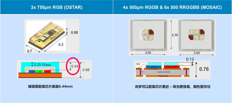 为了改善颜色均一度,艾迈斯欧司朗在原本RGB三颗芯片“一”字形排列的基础上,推出了“田”字型LED-MOS