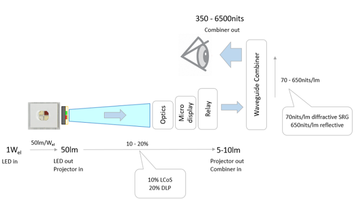 以基于RGGB MOSAIC的AR显示亮度示例,当LED的电功率为1W时,输出的光通量约为50lm,经过前端光学系统后,可以输出10%到20%,也就是说在到达光波导镜片之前会维持5到10lm的光通量。匹配不同的光波导类型,可以实现350nits到6500nits的入眼亮度。