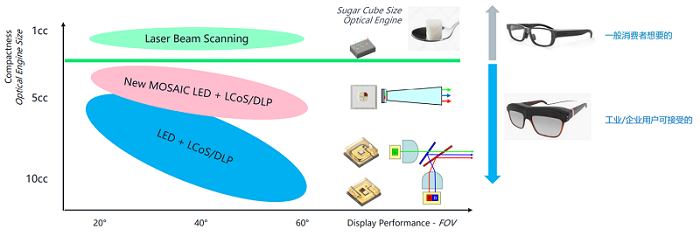 利用MOSAIC LED搭配LCOS或者是DLP的方式可以将光机体积缩小到3-5个cc(立方厘米),这相比传统的LED+分色镜方案的5-10cc的光机体积,在尺寸和重量方面都有了大幅度降低。尽管如此,对于普通消费AR来说,这样的体积依旧不是理想的状态,尺寸需要进一步缩减。由此,艾迈斯欧司朗开发了一款适用于激光束扫描(LBS)技术的RGB集成式激光器,使用该激光器搭配MEMS的方案,可以将整个光机的体积缩小到1cc以下,这对于普通消费类AR眼镜来说有较大的促进作用。
