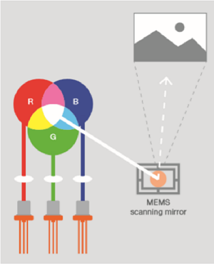 canning mirror(s)。其原理是RGB三色的激光从激光模组发出后,经由光学元件准直以及合束以后到达MEMS mirror,再经由MEMS mirror反射出来,