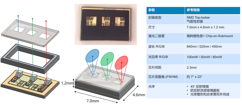 3),可以直接做SMD贴片。并且使用了气密性的封装设计,可以防止特别是蓝光激光器免受外接环境影响从而大幅提升了可靠性。需要强调的一点是,由于这颗激光器还没有集成光束整形光学,所以光束准直和合束需要在封装外实现。