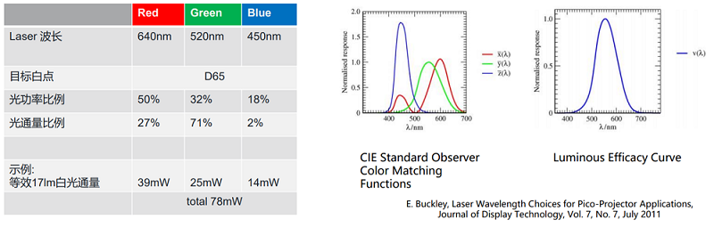 参数可以计算出需要红色的芯片输出39mW的光功率,绿色的需要25mW的光功率,蓝色需要14mW的光功率,这个就是前面78mW总光功率需求的来源。
