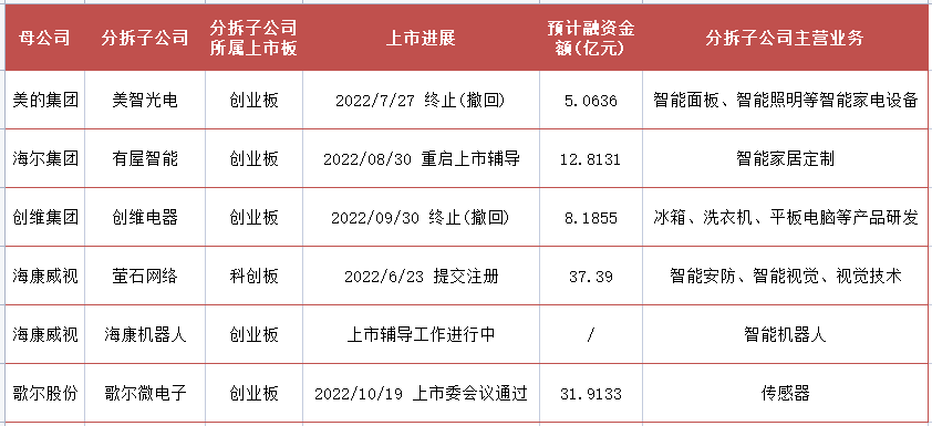 在智能家居行业中,美的、海尔、创维等终端家电厂商,海康威视、歌尔股份等服务商和上游传感器厂商等智能家居产业链上下游都已经在为分拆子公司上市做准备,其中最令人关注就是家电巨头美的、创维、海尔旗下的子公司相继开启创业板征程。