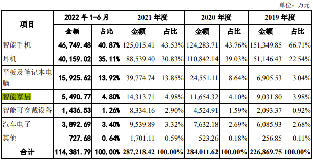歌尔微电子是歌尔股份体系内唯一从事微电子相关业务的主体,主营业务是MEMS器件及微系统模组研发、生产与销售。招股书显示,智能家居领域的MEMS声学传感器收入占比不断提高,2019年至2022年上半年的占比分别为3.98%、4.10%、4.98%、4.80%,同期对应的毛利率分别为17.45%、24.18%、32.03%、30.43%,同样呈现不断上升的趋势。