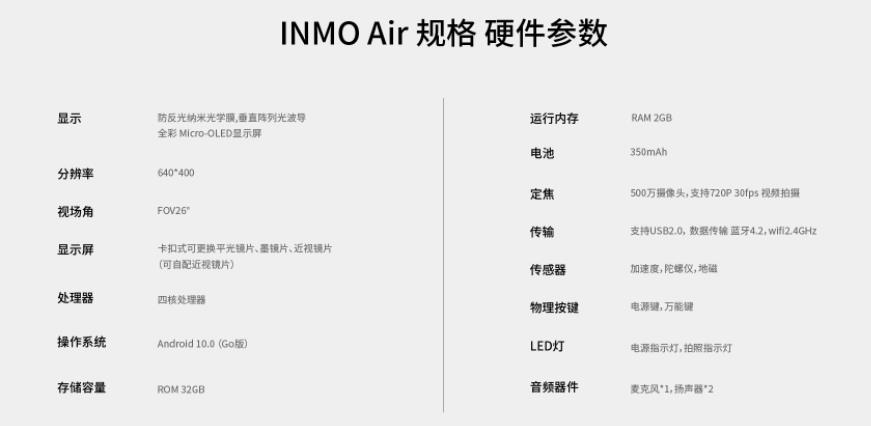 日前影目科技推出的消费级AR眼镜INMO Air;希望通过可穿戴设备让我们真正融入虚拟世界,INMO Air首创了“垂直阵列光波导技术”,可在眼前实现视线完全无遮挡,并在人眼视界内形成等效60英寸的AR虚拟屏,还带有智能语音功能,可以实现语音控制,可以听歌可以导航可以拍照,还可以在步行或者骑行状态下看到虚拟光标导航;集成了很多消费级AR眼镜该有的功能。