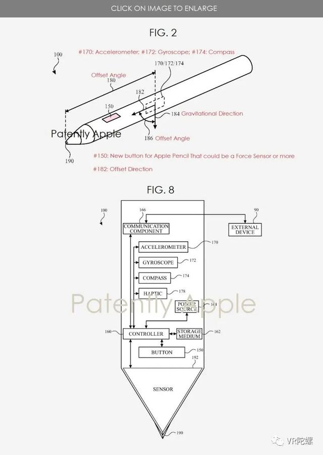 苹果公司在图中展示的Apple Pencil图2显示设备配有传感器,将能够检测尖端何时接触显示表面,所述传感器可以包括电容性传感器、触摸传感器、照相机、压电传感器、压力传感器、光电二极管和/或其他可操作用于检测与物体接触的传感器;上面呈现的图8说明了未来Apple Pencil可能的各种组件。