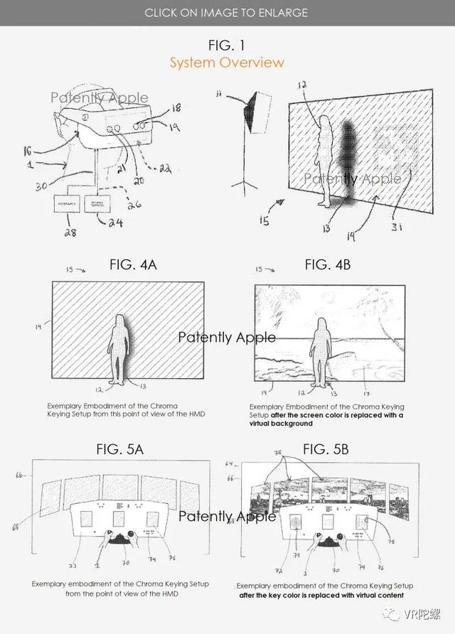 苹果专利图4A示出了如由HMD的照相机色度键控设置的非限制性说明性实施例;图4B示出在用虚拟背景替换键屏幕之后,在HMD中显示的色度键设置的非限制性说明性实施例;图5A示出了如由HMD的照相机所看到的色度键控设置的非限制性说明性实施例;图5B示出了在用虚拟内容替换键色之后,在HMD中显示的色度键设置的非限制性说明性实施例。