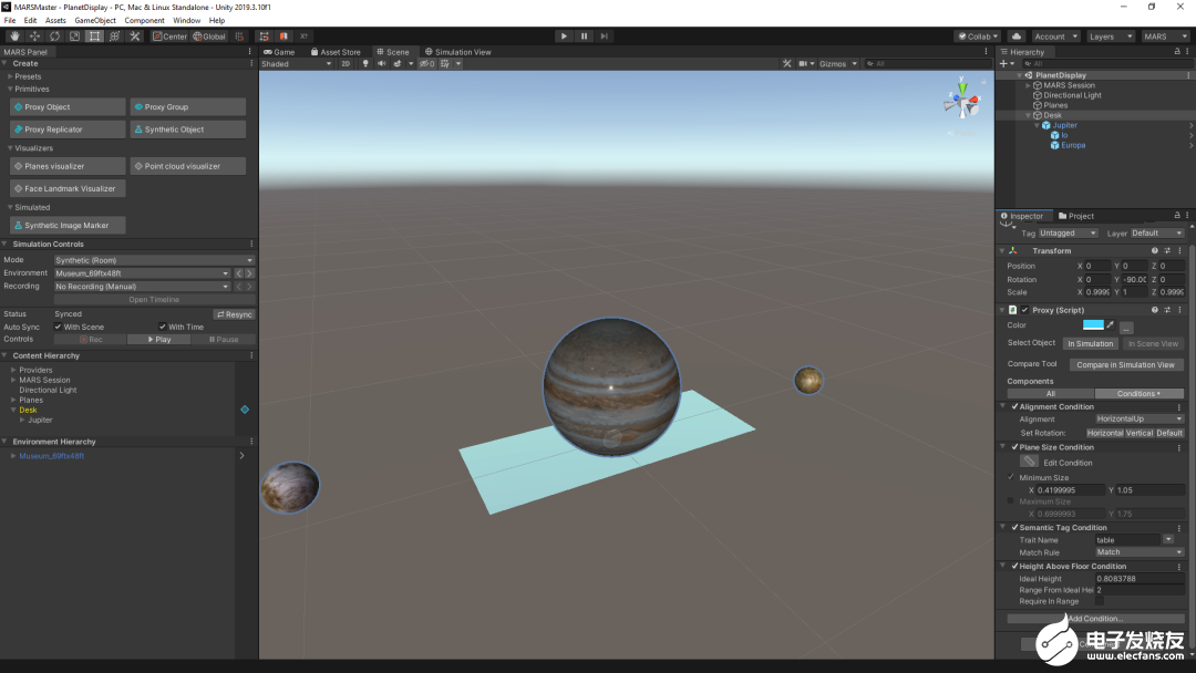用户可使用模拟视图来模拟AR应用在现实中的表现。将内容直接拖入模拟视图后,Unity MARS会自动创建表示物和环境条件。