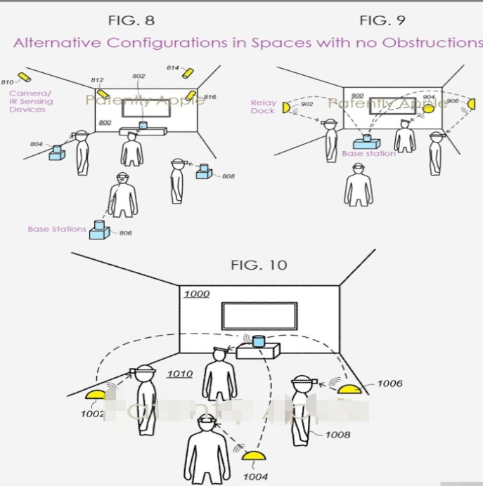 在专利中,苹果除了提出了在房间设置多个摄像头或红外传感器等设备(图8)进行辅助切换,还提出壁挂式通讯基站(图9)、落地式(图10)通讯基站。这些专利最初提交于2018年下半年,而部分细节可能在2017年下半年就已提交。