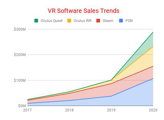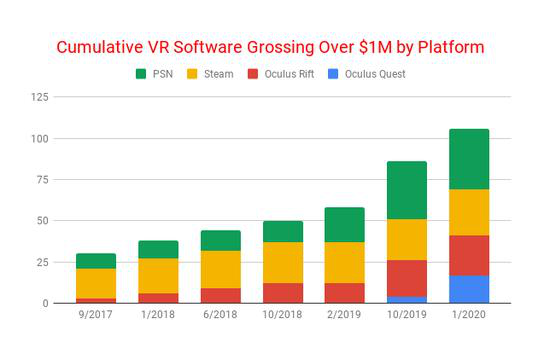 有趣的是,如果我们只要看到软件收入,就会发现过去一年它的市场增长了多少。索尼在2020年1月宣布PlayStation VR的销售额:在过去的4年里销售了500万台头显。我们估计,2019年软件收入将接近1.1亿美元。遗憾的是,Oculus至今仍未公布其数据,但考虑到它的安装基数,预计2019年它将带来近6000万美元的软件收入。