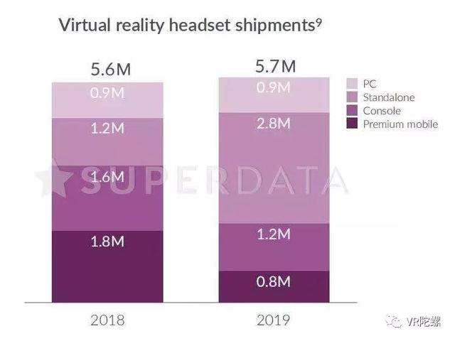 VR一体机在2019年的出货量相比2018年增长了一倍多,从2018年的120万台增长到2019年的280万台,占整个VR硬件出货量的49%。此外,2019年PC VR头显出货量为90万台,主机VR头显(PS VR)出货量为120万台,高端移动VR(盒子)出货量为90万台。