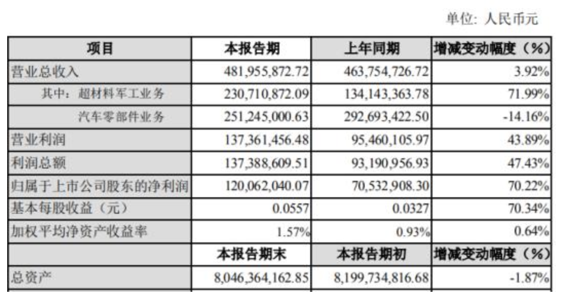 据了解,公司于2017年2月完成非公开股票的发行,并在2017年12月完成了国防军工企业深圳光启尖端技术有限责任公司的资产注入。经过三年的建设,公司主营业务已从传统汽车零部件的生产制造转型成为国防军工超材料技术装备的研制与生产。报告期内,公司分别与多家重点客户签订军工产品批产订货合同,核心产品追加订货额度大幅增加,批产产品种类不断丰富,客户认可度进一步提高。公司新一代单兵AI装备产品智能头盔首批订单在上海完成交付,获得了客户的高度认可。