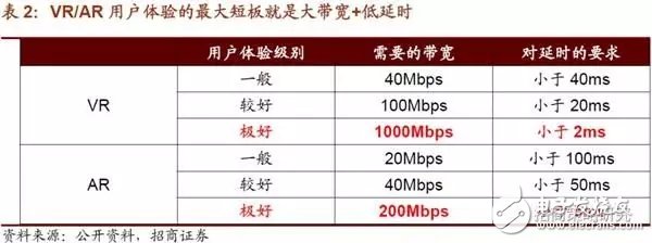 VR/AR是新一代信息技术相互融合的产物,高质量VR/AR业务对带宽、时延要求非常高,例如对于VR来说,要达到非常好的用户体验,需要的带宽要达到1000Mbps以上,延时要达到小于2ms的级别,而对于AR来说要达到不错的用户体验也需要200Mbps带宽以上和5ms以下的延时,这在4G时代是没有办法实现的,唯有5G能满足这样的高速传输能力。