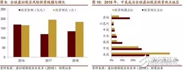 2018年全球虚拟现实风险投资金额增长由负入正,投资频次变化不大。2016年全球虚拟现实初创公司获得风险资本投资总额超过170亿元,虽然2017年风险投资金额约减少三分之一,但投资频次增长近二成,2018年风险投资频次基本稳定,投资总额调整回升至135亿元,单笔投资均值低于2016产业元年亿元规模,但较之2017年增幅高达18%。从地域分布来看,中美成为投资热点地区。2018年获得风险投资的公司中,35%的总部位于美国,28%位于中国大陆,并分别获得54%、25%的资金,中美继续保持风险投资市场主导地位。