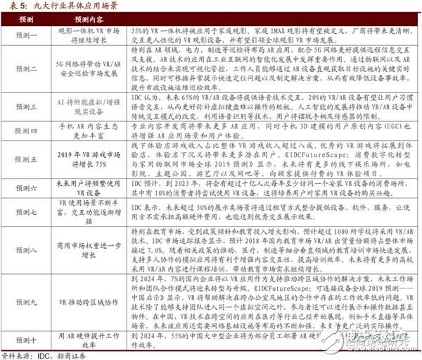 4G仅能够满足部分VR/AR应用,因此5G时代的到来将拓展出全新的应用场景。2月11日,IDC发布2019年VR/AR市场十大预测。IDC认为,目前行业应用正在进一步展开和深入,细分领域消费场景不断得到丰富,VR终端市场逐渐向拥有更佳体验的中高端产品形态过渡,产业生态发展更加成熟。未来,技术革新与应用将会成为VR/AR市场在2019年的重要发展趋势,新技术的成熟和普及将为市场的持续增长赋能。内容生态依然是行业整体进步的关键,未来将会有更多的产业领域向VR/AR技术设备提供商以及内容制作商伸出橄榄枝。IDC预测,至2023年,商用领域的应用场景中,支出规模最大的依次为培训(27.5亿美元)、零售展示(21.4亿美元)和工业维修(16.2亿美元)。而在消费领域,3个应用场景(VR游戏、AR游戏、VR视频)的支出规模预期将于2023年达到95.9亿美元。在预测期内(2018-2023年),有14个应用场景的5年CAGR将超过100%,其中增长最快的为AR游戏、解剖学诊断以及虚拟测试驱动。