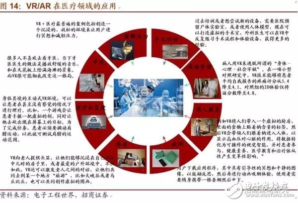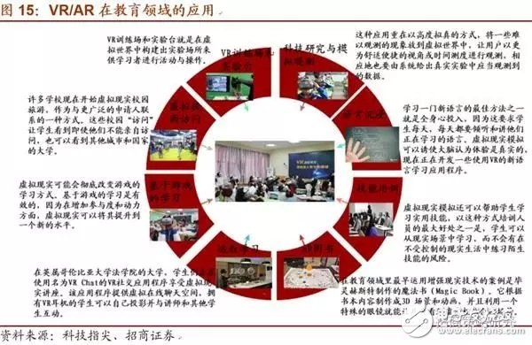 具体到应用场景,例如在视频游戏行业,VR/AR将应用到3D游戏、人机对战、观看虚拟现实影片等方面;在房地产行业,VR/AR将应用到可视化互动体验、样板间展示、城市规划、科技园区等方面;在医疗行业,VR/AR将应用到手术培训、治疗疼痛、病人教育、戒烟甚至牙医等方面;在教育培训行业,VR/AR在语言沉浸、远程学习、虚拟校园访问、技能培训等方面等方面有所应用。