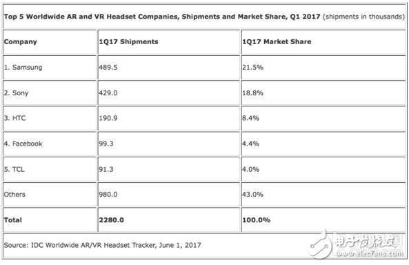 索尼排在第二位,PlayStation VR出货量为42.9万部,市场份额为18.8%。IDC预计索尼在短期内很可能会继续在VR市场占先。