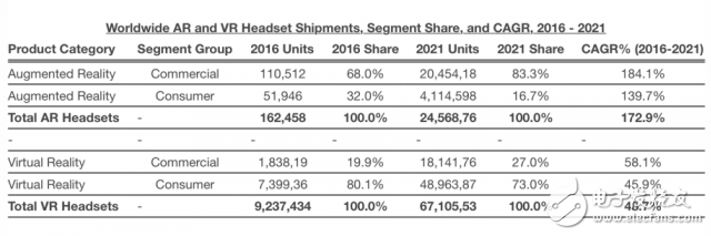 电子发烧友早八点讯:WWDC 2017 之后,相信大家都看得出苹果对待 AR/VR 是非常认真的,软件上有 iOS 11 的 ARKit,硬件上有全新 iMac 系列。为此,IDC 用新的数据来预测 AR/VR 的未来,“到 2021 年,专用的 AR 和 VR 头盔设备将会达到一亿部”,作为对比,去年这个数字还不到 1000 万。