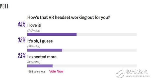 近日,美国科技媒体TheVerge就发起了一项调查投票,题目非常简单,就是让购买了高端VR头显的用户来评价,觉得自己买的东西是否值回票价。结果还是相当惊人的,投票从北美时间11月25日开始,截至到北京时间11月27日,共有1653名用户参与投票,其中觉得“我超爱I Love It”的用户有743人,占总人数的45%;觉得“还行吧It’s ok, I guess”的用户有525位,占总人数的32%;而觉得VR头显不如预期(Ecpect More)的用户有385位,占总人数的23%。
