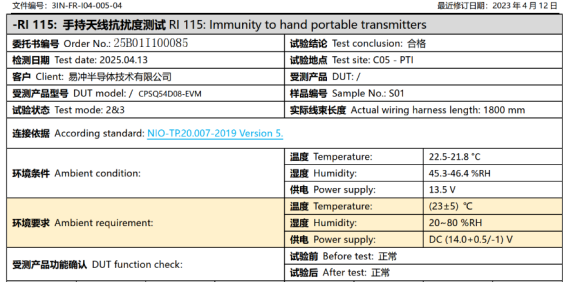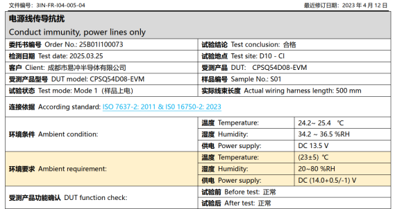 图1中可以看到在抗干扰方面,易冲半导体的CPSQ54xx高边系列因为采用垂直单晶工艺,避免了在晶圆外部传输敏感信号,天生对EMC中的各种干扰有良好的屏蔽作用。图3和图4来自CPSQ54D08的CI和RI测试摸底报告。测试环境均为额定电流负载测试。