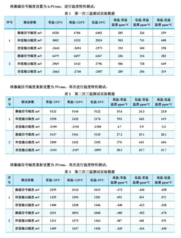 在3Vrms的激磁信号工作时,激磁信号的的温漂较大,呈负温度特性,差值输出的温度特性与激磁信号的温度特性变化仍然一致,而和值输出的温漂仍然较大。