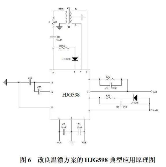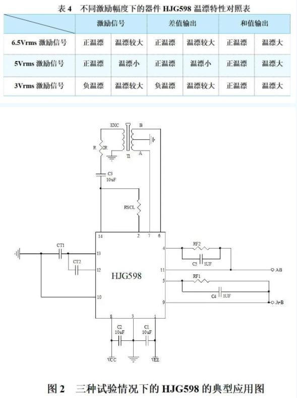 通过对器件工作原理与实验数据进行分析总结,提出了一种改善器件温漂特性的应用措施并进行了实验验证,验证了在激磁信号反馈回路添加温偿二极管能够有效的减小整个器件HJG598的激磁与差值输出的温漂,在和值输出反馈电阻回路添加二极管也能够对和值输出的温度特性起到改善作用,即利用二极管的开启电压的温度特性进行温漂补偿是一种有效的实施措施。