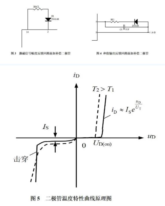 如图所示:环境温度的升高将会导致半导体的本征激发能力增强,即二极管PN结内的少子浓度上升,反向饱和电流IS增大(由少子漂移运动能力决定),进而使得正向电流增大,空间电荷区变窄,导通电压减小。而这个导通电压变小的特性与温度的变化基本是线性的:大约每1℃的上升将会使得二极管导通电压下降2mV。二极管的导通电压变化与温度的变化是有负向线性关系的。HJG598的反馈回路应用二极管进行补偿后,可预见二极管的温度特性能够对激磁信号幅度温漂进行补偿。