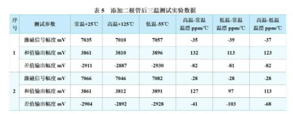 能够观察到激磁信号与差值信号的温漂都得到了减小,基本小于100ppm/℃,和值输出的温度特性也得到了明显改善,温漂参数也只有150ppm/℃以下,即二极管的补偿有着改善器件的温漂特性的作用。但是此时和值输出的计算公式在添加二极管改善温漂后也发生了变化,计算公式将修正为: