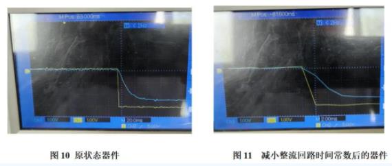 上图中黄色信号为解调部分的输入信号,蓝色信号为输出信号,能够观察到原状态时间常数大的器件从输入信号产生至输出信号完成输出这一段信号的建立时间有20mS左右,而更改后时间常数小的器件其信号的建立时间只有4mS左右。即在减小了内部整流电路的时间常数设置后,器件HJG598解调部分的响应速度增大了,但其直流输出信号上的交流残余量值也增大了,器件的输出噪声电压增大了,即器件解调部分响应时间的快慢与输出噪声电压大小是负相关的。如要想器件的响应时间加快,必须在器件内部调节减小整流网络的时间常数,但这也会导致器件的输出噪声电压增大。