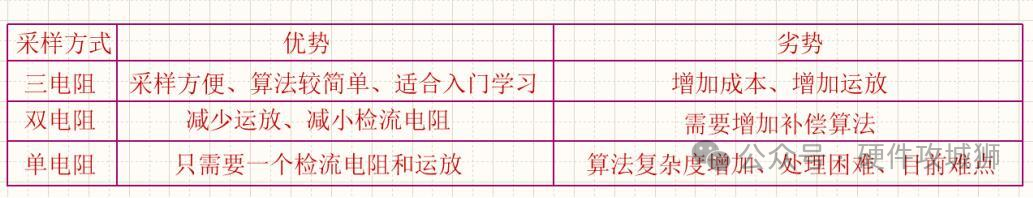 电流采样是FOC中基础且重要的一个步骤,只有电流采样准确了整个算法才能获得好的效果。电流采样是采集续流电流,也就是在三个下管导通的时候采样,采集中间时刻的电流,可以反映平均电流(用电感续流来理解,在电感续流的时候,中间时刻的电流就可以反应平均电流)。电流采样方式一般分为三电阻、双电阻、单电阻采样,其优缺点如下图所示。