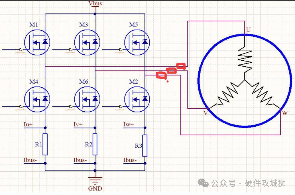 这里使用下采样电阻,也就是电流采样电阻放在下端,有两个好处:一是共模电压接近0V,信号处理相对比较容易。二是在一个PWM周期内采样电阻存在不通电的情况,这样可以降低采样电阻的功率。另外,母线上还有一个母线电阻,这个电阻有两个作用。一是用于单电阻采样;二是采集母线电流,实现过流保护。另外,存在将电阻串在相线上的情况,如下图所示。此时相比下电阻采样,采集的电流就不同了,因为电流始终是连续的,不存在采样窗口的问题。为了采集平均电流,可以采集三上桥臂导通的中间时刻的电流。但是这种方案运放的共模电压也高了,并且由于电流始终流过电阻,所以电阻的功率要比下电阻采样要高。