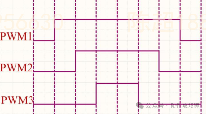 当下管的PWM占空比很小的时候,如下图所示的PWM3。由于ADC采样需要保持一定的时间,所以占空比很小的时候采集到的数据就可能不准。由KCL可知此时的三相电流的和为0,此时如果是三电阻采样方案,那么可以使用另外两相占空比大的算出第三相的电流。而如果是双电阻采样那么就没办法了,只能就这样使用,或者限制下管的最小占空比,这样才能保证采样的电流是准确的。对于单电阻采样来说,需要根据不同的开关组合得到对应的电流,而且需要在一个PWM周期内采样两次,依靠算法来重构三相电流,所以是最困难的一种方案。