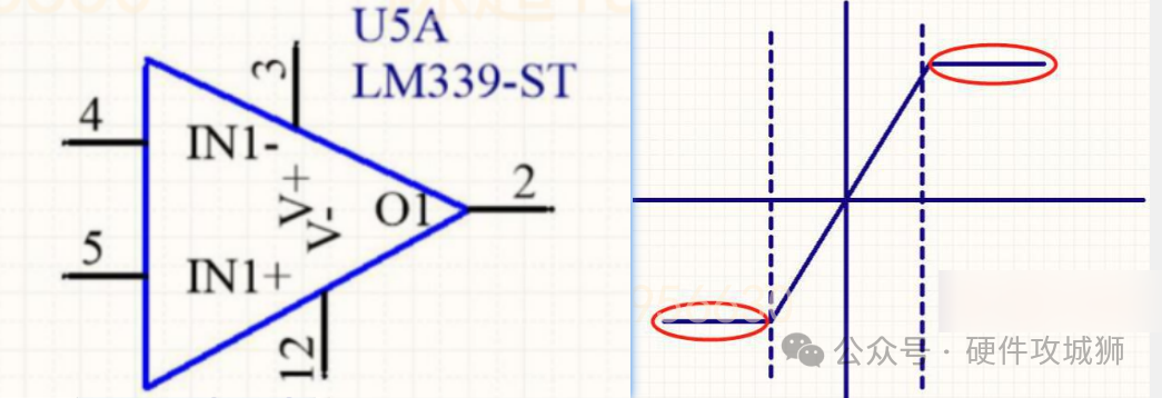 如下图所示,比较器的两个输入端接两个模拟信号,比较器的输出是一个数字信号,即高低电平。但是比较器内部是集电极开路或者漏极开路输出,所以需要在比较器的输出端接上拉电阻。比较器输出数字信号,他的跳边沿很陡。也就是说比较器的输出要么饱和,要么截止,而运放一般工作在放大区。所以按照输出特性曲线来说,比较器工作在下图的红圈处(注意下面的红圈也可以认为是负饱和区,只不过一般运放的负端接GND,那么就是0V,也认为是截止)。而运放工作在虚线内的放大区。为了让比较器的输出沿更陡,一般接一个正反馈。而运放工作在线性区。为了让运放不饱和,一般会接一个负反馈,抑制运放的饱和,让他工作在线性区。此外,运放接入正反馈,也可以当做比较器来使用。