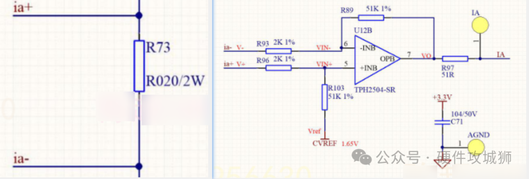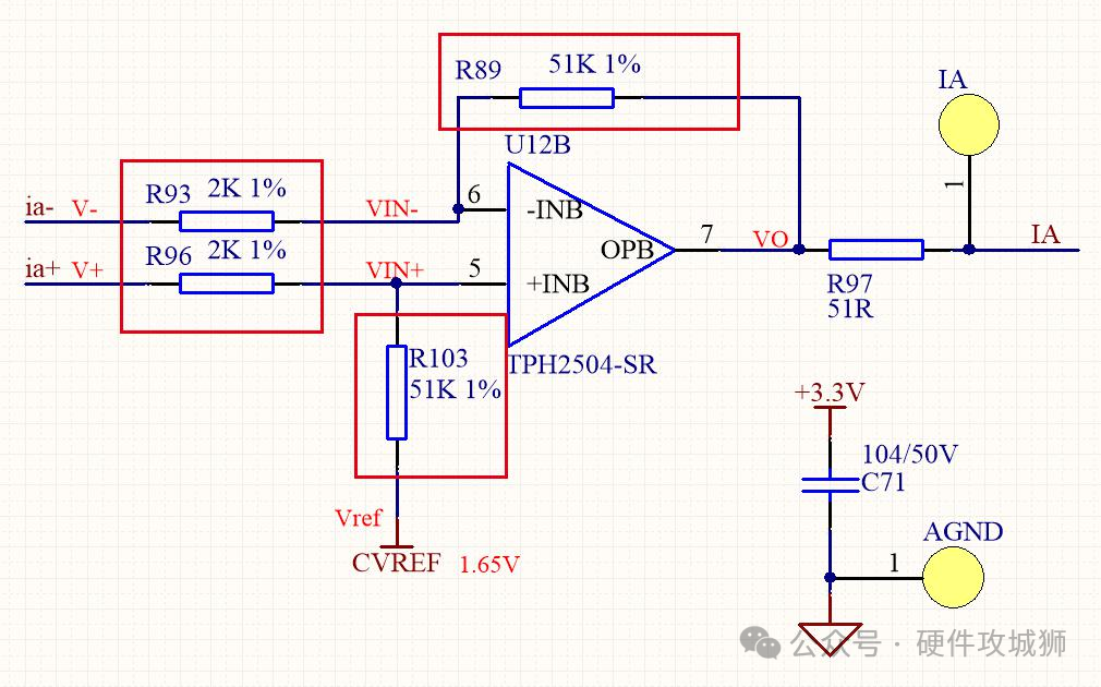 此外,有的时候会在运放的两个输入端接入一个pF级别的电容,用于滤除差分干扰。但是只要能够控制这个差分回路,可以不用接这个电容,接了这个电容可能会对信号造成延迟。所以即使加,也是加入一个很小的电容,pF级别。运放的输出到单片机的ADC引脚之间有一个电阻R97,这个电阻一般取值为几十欧姆,要考虑ADC内部的采样保持电容的充电时间。这个电阻是充电阻抗,可以破坏走线寄生参数带来的震荡。因为走线上存在寄生参数,很容易满足震荡条件,加了电阻的话可以破坏震荡条件。(?)