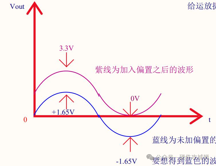 由于采样电阻上的电流可以从下往上流,也可以从上往下流,也就是两端的电压可正可负,那么输入运放的差分电压就是正负电压。如果运放是正负电源供电,那么此时运放可以输出放大的正负电压,但是单片机没法检测负压信号,所以运放只能单电源供电。如果运放是单电源供电,那么又无法输出负压,所以需要对负压进行处理,也就是对负压进行电压抬升,如下图所示。这个抬升电压也很简单,根据波形对称,再考虑单片机的AD采样电压为3.3V,所以选择3.3V的一半。