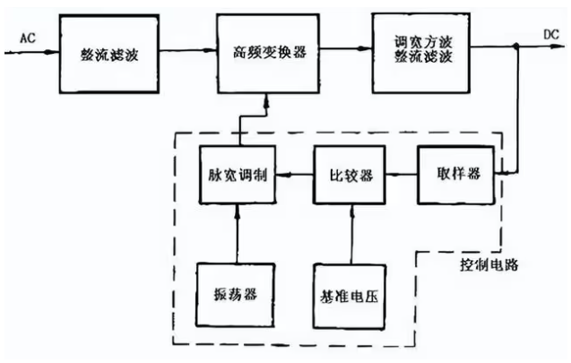 开关型直流稳压电源它的电路型式主要有单端反激式、单端正激式、半桥式、推挽式和全桥式。它和线性稳压电源的根本区别在于电路中的变压器不工作在工频而是工作在几十千赫兹到几兆赫兹。功率管不是工作在线性区,而是饱和及截止区,即工作在开关状态;开关型直流稳压电源也因此而得名。开关电源大致由主电路、控制电路、检测电路、辅助电源四大部分组成。