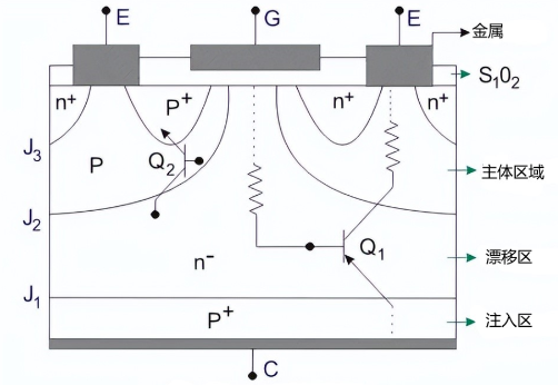 IGBT结构是一个四层半导体器件。四层器件是通过组合 PNP 和 NPN 晶体管来实现的,它们构成了 PNPN 排列。