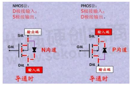 注意一点,MOS管做开关器件的时候,输入输出一定不能接反,接反的寄生二极管一直处于导通状态,MOS本身就失去开关的作用了。