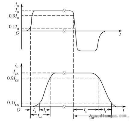 存储时间ts:把基极电流从正向IB1变为反向IB2时,iC下降到0.9ICS所需的时间。