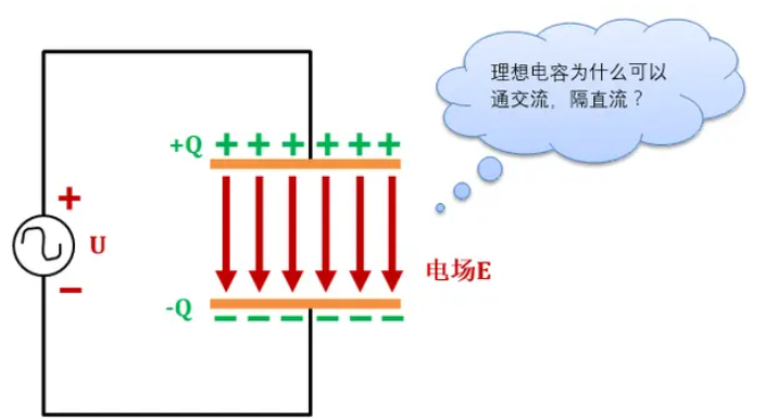 如上图所示,在两块距离较近、相互平行的金属平板上(平板之间为电介质)加载一个直流电压;稳定后,与电压正极相连的金属平板将呈现一定量的正电荷,而与电压负极相连的金属平板将呈现相等量的负电荷;这样,两个金属平板之间就会形成一个静电场,所以电容是以电场能的形式储存电能量,储存的电荷量为Q。