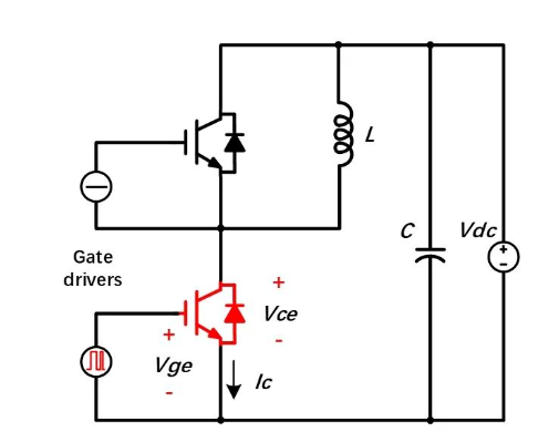 双脉冲测试(DPT)是一种被广泛接受的评估功率器件动态特性的方法。以IGBT在两电平桥式电路中应用为例,如下图,通过调节直流母线电压和第一个脉冲持续时间,可以在第一个脉冲结束和第二个脉冲开始时捕捉到被测器件在任何所需的电压和电流条件下的开关瞬态行为。