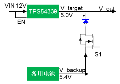 客户使用FCCM模式的TPS54339DDAR器件,用于12V转5V,同时有备用电源的需求,备用电源经由开关电路S1连接到BUCK的输出母线上。当检测到TPS54339输入电压低于10V时,开关电路S1闭合,系统由备用电池供电。