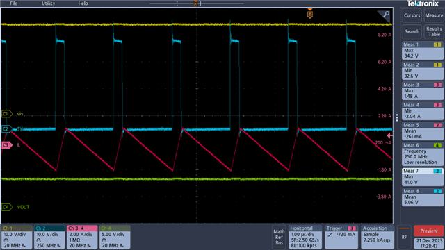 将输出电压调整5.26V-5.32V,可以看到,输入端的电压高达33V,已经超过了TPS54339 VIN引脚最大耐压25V,可能会对器件造成永久性损坏。