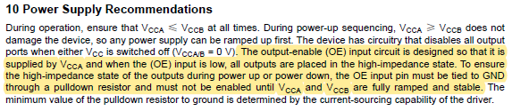 检查线路图后发现, OE上拉到3.3VCCB。规格书明确指出,针对在上电过程中,OE在电源稳定之前必须保持低电平。