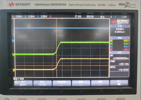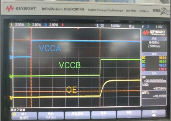 现同时通过原始电阻分压采样VCCB上电时序和OE的管脚波形,发现OE与VCCB同时上电。
