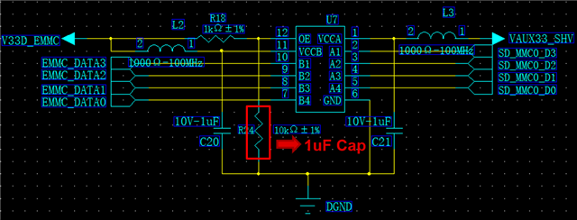 EMMC与AM3352挂载失败,定位为TXB0104工作异常。实测中发现如图中线路所示: