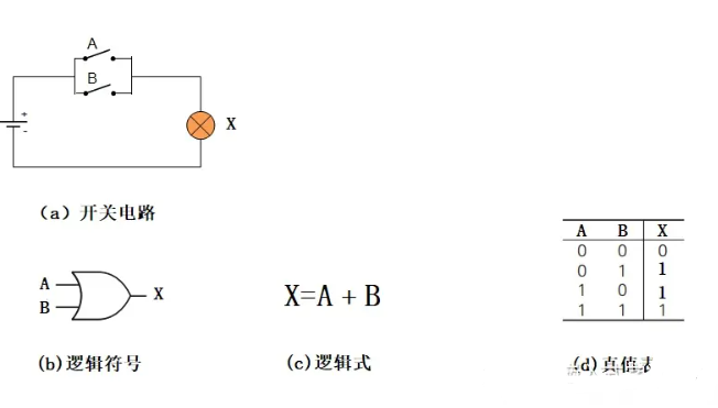 这种电路的逻辑符号如图中( b ),逻辑关系式是:X=A+B,如图中( c ),即若输入中有“1”,则输出为“1”。若全部输入“0”,则输出为“0”。