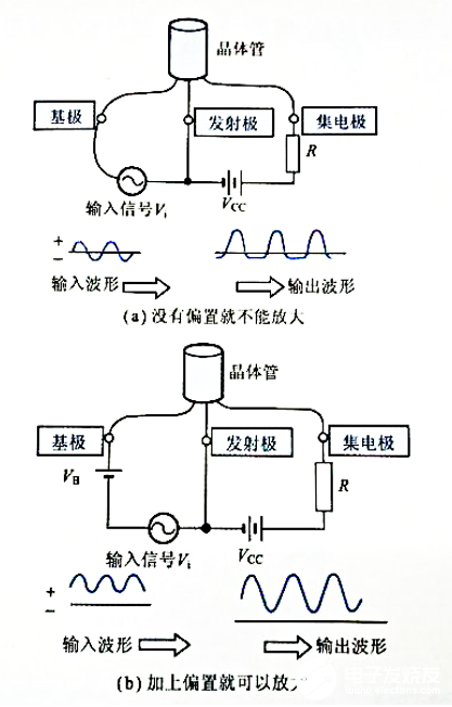 为了使晶体管进行放大工作,必须施加偏置(bias)。所谓偏置,就是在需要放大的信号输人处(发射极接地时,PNP型、NPN型均为基极-发射极之间)预先流通一定大小的电流(或加载直流电压 ,参见图)。